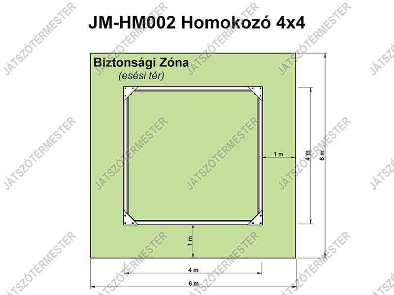 4m x 4m alapterületű, négyzet alakú alap homokozó a négy sarkán HDPE ülőfelülettel. Homok nélkül szállítjuk. Közterületre, óvodák, iskolák udvarába ajánljuk, kicsiknek és nagyoknak egyaránt kedvelt játszóhelye lehet. Ütéscsillapító réteg kialakítása nem szükséges.