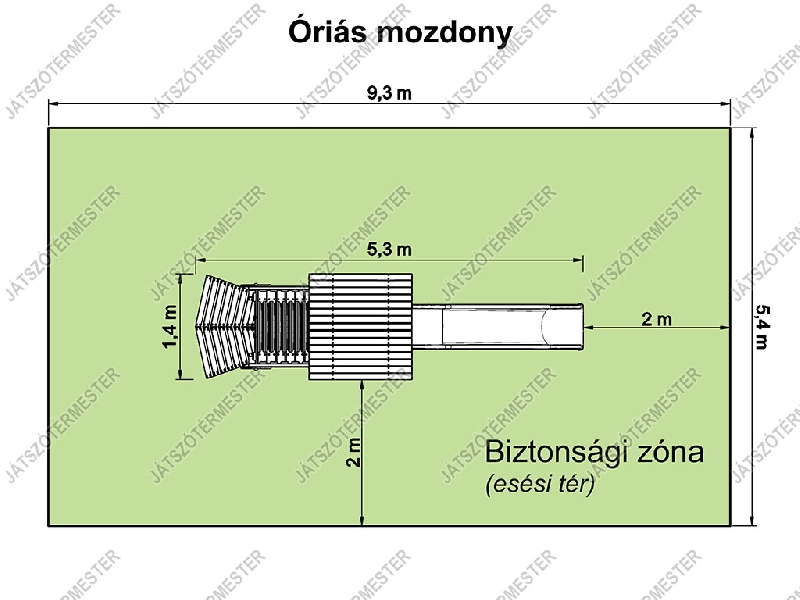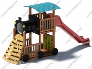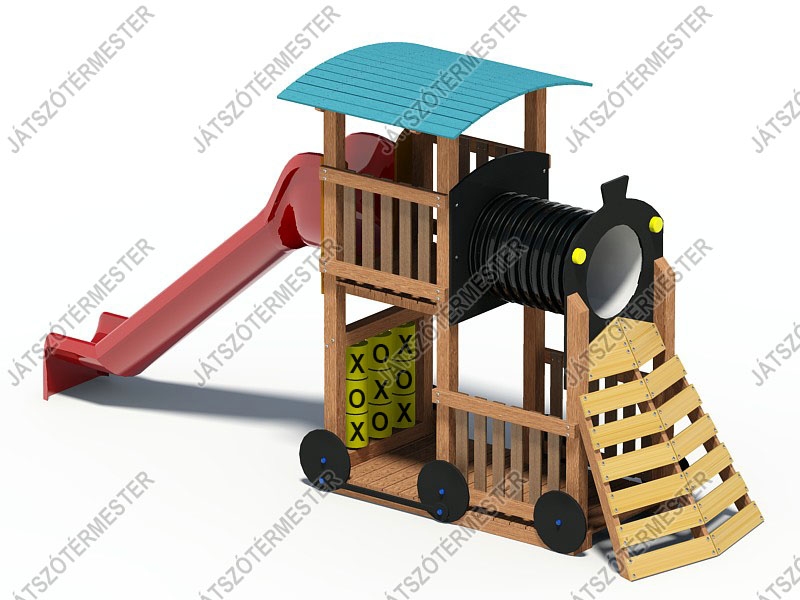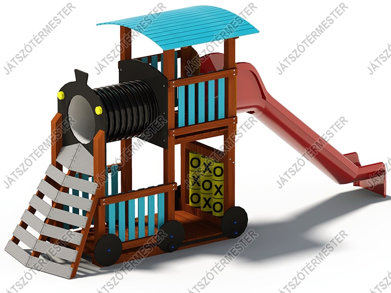 A mozdonyhoz képest ez a játék további izgalmas funkciókat tartogat. A felső szint platómagasságát megemeltük, így már két szinten élvezhetik a gyerekek a nagy mozdony lehetőségeit. Az alsó szinten a búvócső alatti rész oldalról mellvédeket kapott, a megemelt csőalagúthoz pedig a tolólap formájú mászófalon lehet felmászni. További hasznos része a játéknak az alsó szinten hátul található OXO logikai játék, mely a klasszikus amőbajáték játszótéri változata, forgatható hengerekkel. A nagy mozdonyra 3m-es csúszda került, nagyobb beülőmagassággal, élvezetesebb csúszási lehetőséggel. A nagy mozdonyt óvodákba, iskolákba és közterekre is egyaránt ajánljuk. Ütéscsillapító réteg kialakítása szükséges.