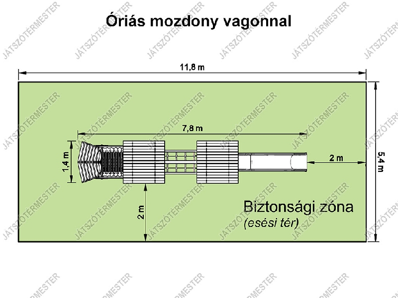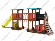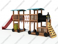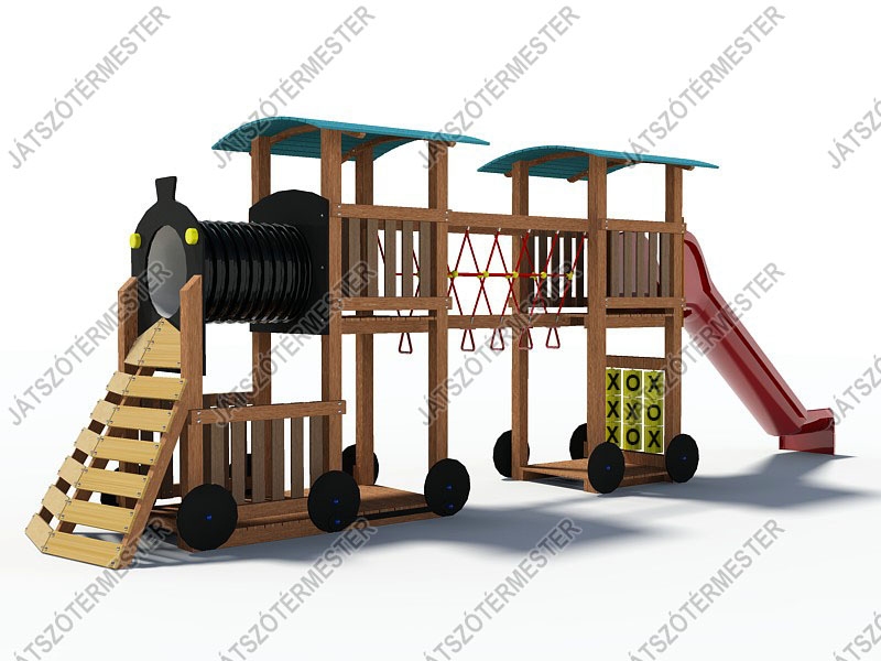 A mozdony családunk legnagyobb és legsokoldalúbb játszóeszköze. Még több funkcióval, és kihívással, változatos feladatokkal várja a gyerekeket. A nagymozdony mászófala és alagútja mellé a vagonhoz egy átvezető gerendahídon lehet átegyensúlyozni, a korlátokat és a kétoldali biztonságot mászókötélből kialakított háló jelenti. A vagon felül 3m-es csúszdában, alul a népszerű OXO-játékban végződik. Új lehetőség a gerenda alsó részére erősített kapaszkodósor, amely függeszkedőelemként funkcionál a nagymozdony és a vagon között. Ezt a játékot is szívesen ajánljuk óvodákba, iskolákba és közterekre is egyaránt. Ütéscsillapító réteg kialakítása szükséges.