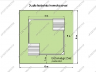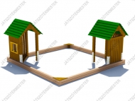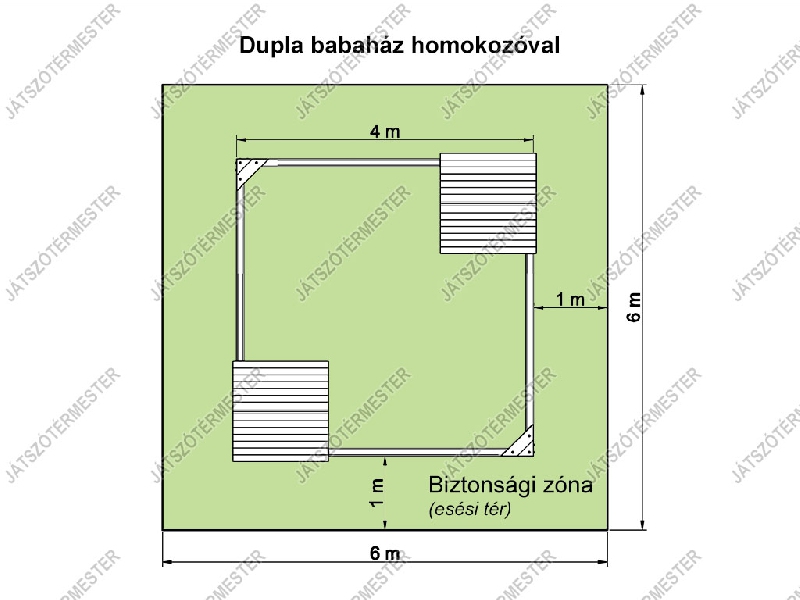 Két darab 1,5 x 1,5 m alapterületű játszóház 4 x 4 m-es homokozóval. Homokozóval egybeépített játszóházainkat nagyobb alapterületű játszóterekre ajánljuk. Bölcsődékbe, iskolákba, óvodákba, közterekre egyaránt telepíthető. Kisebbek és nagyobbak egyaránt kedvelik, általában központi szerepet tölt be a többi játék között. Ütéscsillapító réteg kialakítása nem szükséges.