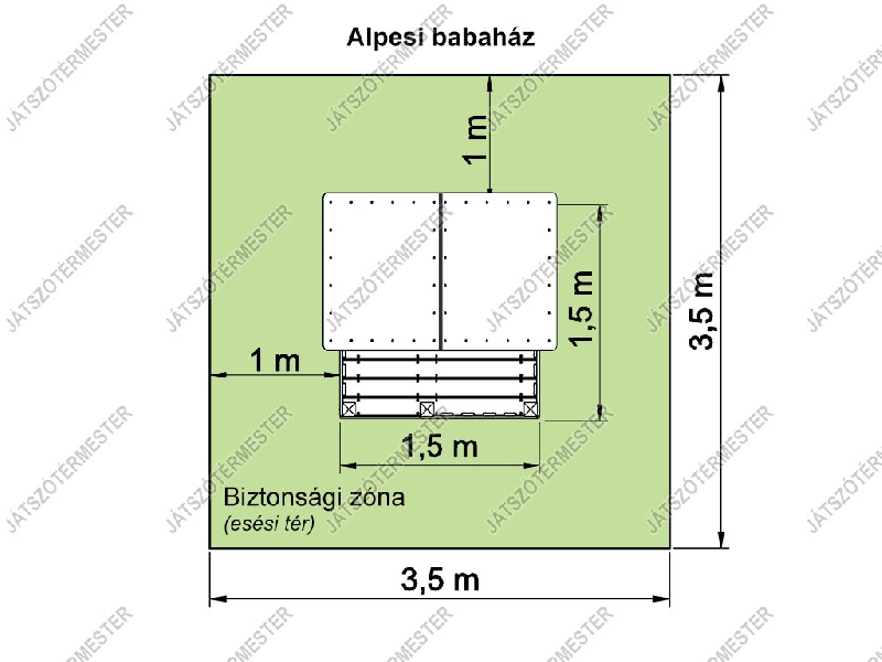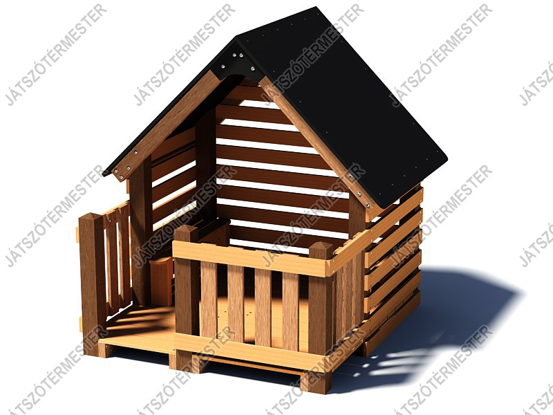 Ez az egyik legszebb és legközkedveltebb játszóházunk. Alapterülete 1,5 x 1,5 m. Saját padlózat, a felépítmény első oldala nyitott, a házikó előtt terasz, melvéddel és korláttal. Az alpesi babaház játszóházunkat bármely játszótérre szívesen ajánljuk, bölcsődékbe, iskolákba, óvodákba, közterekre egyaránt. Kisebbek és a nagyobbak is kedvelik, búvóhelynek, találkahelynek is megfelelő. Ütéscsillapító réteg kialakítása nem szükséges.