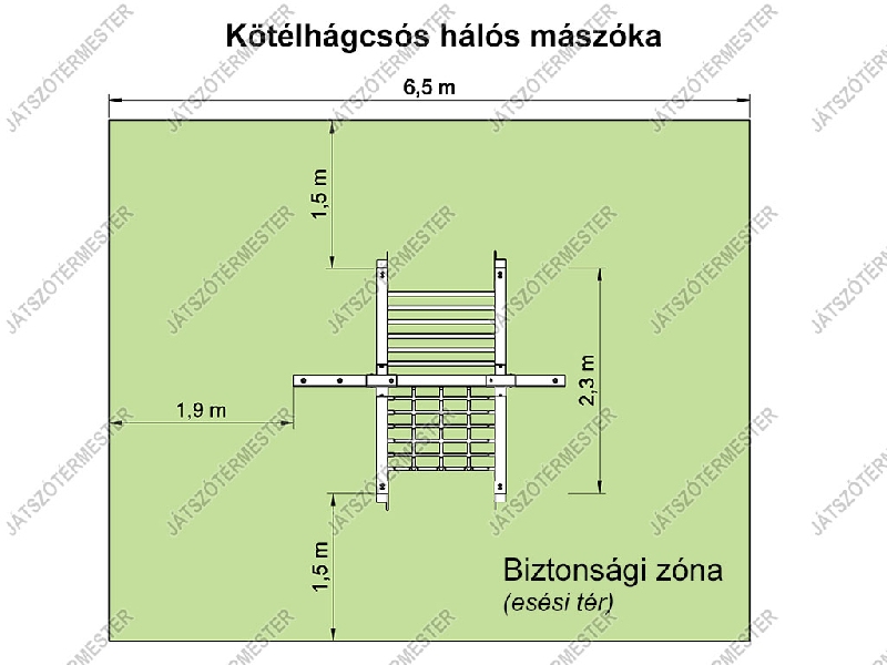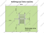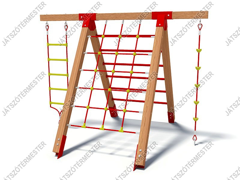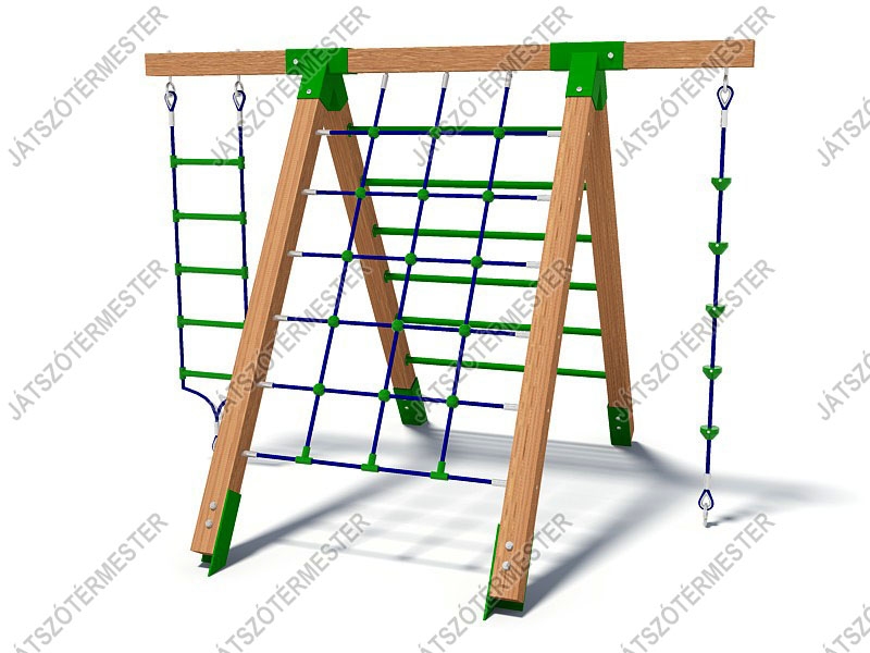 Hagyományos, ferde mászóka, létrával, vele szemben pedig mászóhálóval. A mászókát kétoldalról kiegészítettük egy kötélhágcsóval és egy függőleges kötéllel, amely műanyag mászócsomópontokat tartalmaz. A kötélhácsó, és a függőleges kötél is stabilan a talajhoz van rögzítve földhorgony segítségével. A mászókát választott színű kiegészítőkkel (zöld, v. piros) tudjuk szerelni. Óvodák, iskolák, közterek parkok kedvelt játéka lehet. Ütéscsillapító réteg kialakítása szükséges.