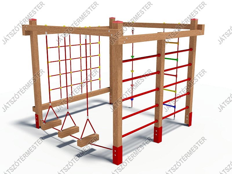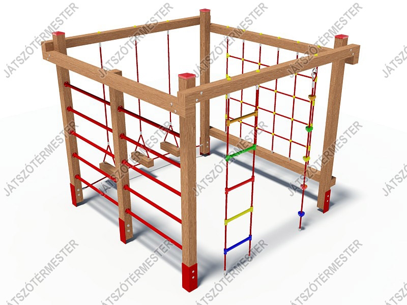 Kompakt, négyzet alapterületű mászóka továbbfejlesztett mászófunkciókkal, létrával, kötéllel, mászóhálóval és egy speciális egyensúlyozó résszel. A három felfüggesztett gerenda darab és a kötelek segítségével tesszük próbára az erre vállalkozók egyensúlyérzékét. A gerendákat a kilengés korlátozása miatt alul egy közös mászókötéllel rögzítettük.