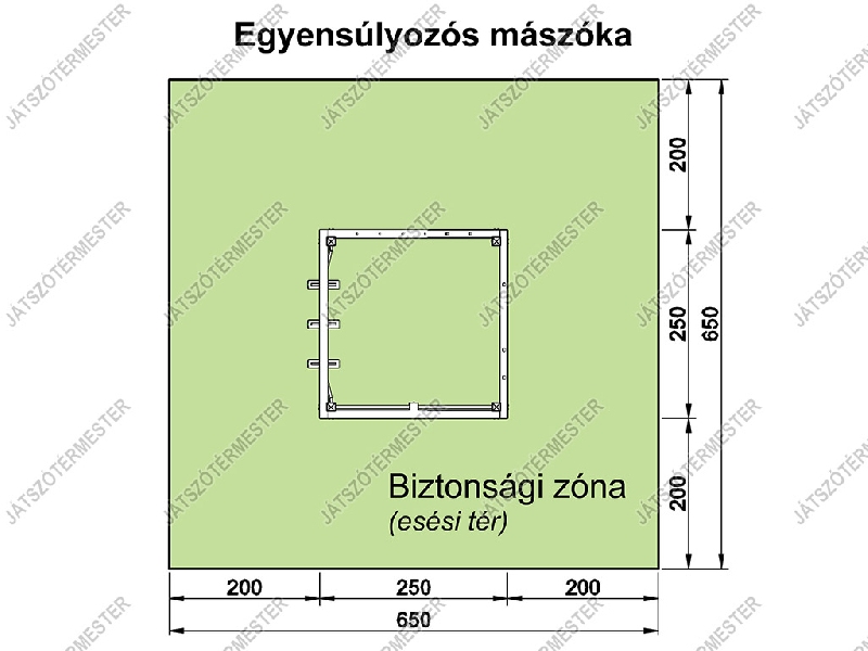 Az egyensúlyozós mászóka a hagyományos négyzet alapú mászókák egyik kedvelt alternatívája lehet, szórakoztató mozgásfunkcióival, egyensúly-, és állóképesség fejlesztő lehetőségeivel. Ovisoknak is ajánljuk, és természetesen iskolákba, közterekre, parkokba, önkormányzati játszóterekre, a hagyományos mászókák alternatívájaként, vagy kiegészítőjeként. A termék Gyártói Megfelelőségi Nyilatkozattal rendelkezik és megfelel a játszóterek biztonságosságáról szóló 78/2003. (XI. 27.) GKM rendelet és az MSZ EN 1176-1 szabvány ajánlásainak. Ütéscsillapító réteg kialakítása kötelező!