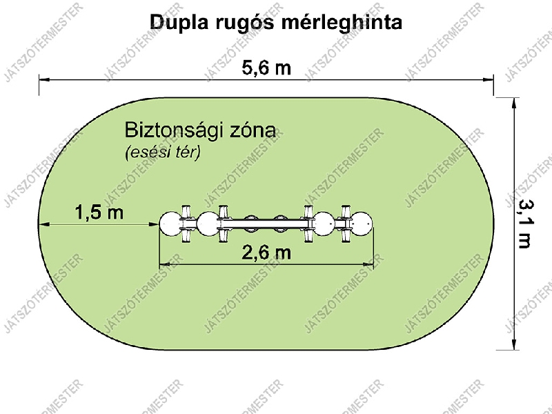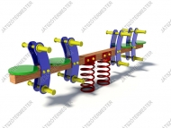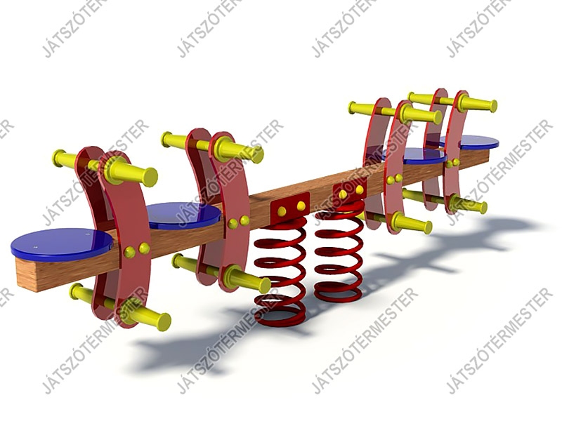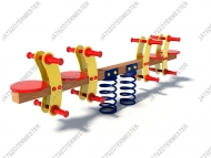 Ebbe a játékba összegyúrtuk a két játszótéri alapjátékot: a rugós játékot és a mérleghintát. A dupla rugós mérleghinta egy időtálló, strapabíró eszköz, melyet minden közterületi játszótérre, óvodákba, iskolákba, parkokba egyaránt javasolunk. A műanyag kiegészítőkkel illetve az alkalmazott műanyag lemezek segítségével több színváltozat is kialakítható, rendelhető. A játékhoz külön ütéscsillapító réteg kiépítése nem szükséges.