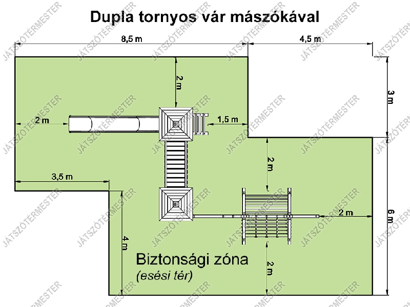Ezt a játszóvárat mérete, külalakja és a sok kínált mozgásfunkciója miatt közterületi, városi, nagyobb játszóterek központi elemeként is ajánljuk. A termékhez ütéscsillapító réteg kialakítása kötelező!