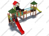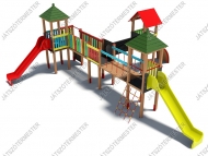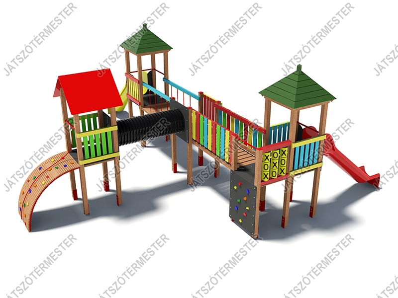 Nagy alapterületű színes játszótéri eszköz átjáróval, dupla csúszdával, felmászókkal, egyensúlyozóval. A tornyokra a feljutás mászófalak segítségével lehetséges. Az íves mászófal újszerű és plusz kalandot jelent a meglévő funkciók mellett. Az egyszerűbb feljutási lehetőség az acélbetétes kötélből készült mászóháló segítségével lehetséges. A tornyok közötti átjárást a hátsó toronnyal búvócső, az elülső szárnyak között pedig egyensúlyozó, illetve színes merev híd biztosítja. Az erőd tornyaiból a két csúszdán való lecsúszás közkedvelt élménylehetőség a gyerekeknek. A testmozgás lehetősége mellett az egyik oldalon elhelyeztünk egy OXO amőba játékot a szellemi és logikai képességek tornáztatása érdekében.