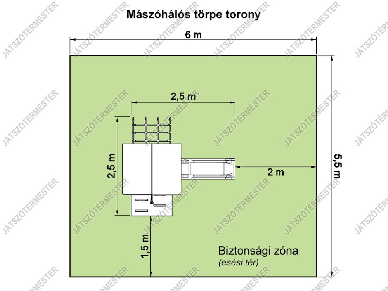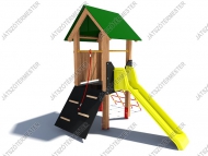 Alacsony játszótorony fa tetővel, MINI csúszdával. A torony padlómagassága 0,9 m, a feljutást erdei rámpás mászófal, másik oldalon pedig mászóháló biztosítja. Bölcsődés-óvodás korosztály részére kifejlesztett alap játszótorony könnyen mászható elemekkel. Az erdei rámpán a rögzített kötél biztosít kapaszkodási lehetőséget. 2,5m-es csúszdával együtt telepíthető, beülőmagasság: 0,9 m, Ütéscsillapító réteg kialakítása nem szükséges.