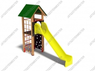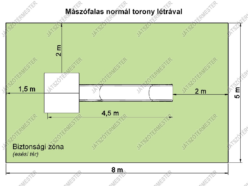 Normál méretű mászótorony színes, kompakt lemezből készült tetővel. Padló- és a csúszda beülőmagassága: 1,4 m. A csúszdával átellenes oldalon a lábak közt kialakított függőleges létra teszi lehetővé az egyszerű feljutást. Az oldalakon függőleges mászófal búvólyukkal, illetve 16 mm-es acélbetétes kötélből mászóháló került kialakításra. Az eszközt a nagyobb korosztály óvoda-nagycsoportosok és iskolások részére ajánljuk, óvodákba, iskolákba, közterekre. A torony alá ütéscsillapító réteg kialakítása szükséges!