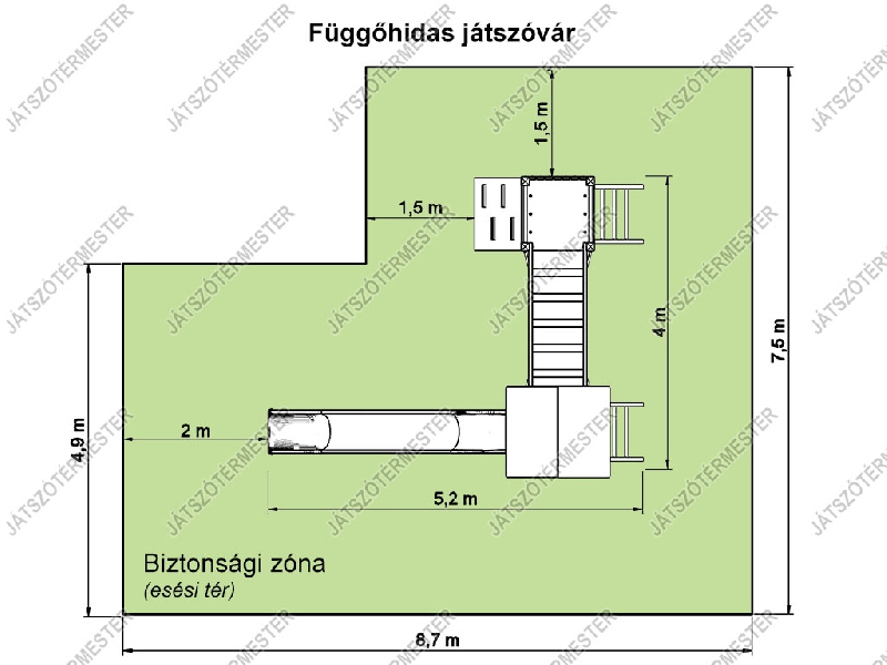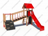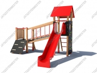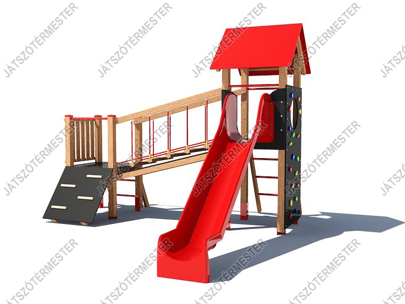 A játszóvár egy törpe bástyával, normál toronnyal. A tető nélküli bástya padlómagassága 0,9 m, egy oldalán fa korlát mellvéddel, további oldalán egy erdei rámpa illetve létra található. A ferde egyensúlyozóként kialakított függőhíd 16 mm-es acélbetétes kötéllel kialakított lépegetőkkel biztosítja a kalandos átjárást a toronyba. A torony teteje színes kompakt lemezből készül. Torony funkciók: csúszda, létra, függőleges mászófal bebúvónyílással. A játszóvár az idősebb korosztály részére jelent közepes kihívást és szórakozási lehetőséget. Ajánljuk óvodákba, iskolákba, közterekre. Az eszköz biztonsági zónájában ütéscsillapító réteg kialakítása szükséges!