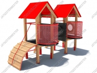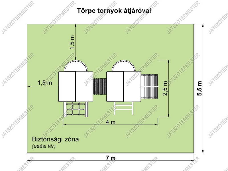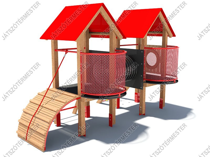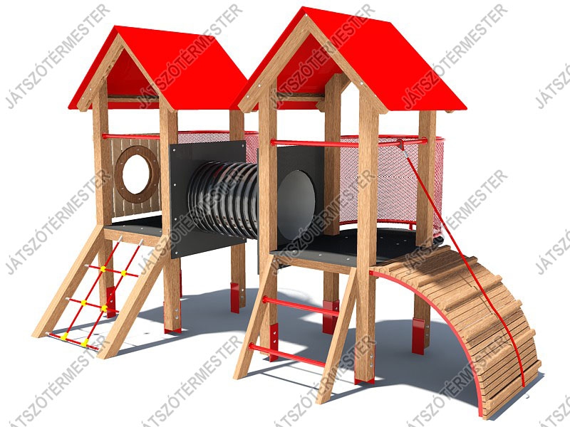 A törpe tornyok között kicsik és nagyobbak egyaránt találhatnak kihívást, kalandot. A két darab színes kompakt lemez tetővel épített torony egy biztonságos műanyag átjáró csővel van összekötve. Egyszerre több gyerek élményekben gazdag játékát biztosítja. A kalandokról a különböző funkciók gondoskodnak: az elülső mászóháló, mely 16 mm-es, acélbetétes mászókötélből készül, ferde létra, közepes nehézségű elemként pedig egy íves mászófalat is elhelyeztünk a bátraknak. A tornyok átellenes oldalán félkör alakú erkélyek találhatók, melyek fantáziaelemként szolgálnak, harmonizálva az oldalt kialakított hajóablakkal. Az átjárós mini tornyokat egyaránt szeretik bölcsődések, ovisok és még az iskolás korosztály is szívesen tölti köztük az idejét. Nagyobb bölcsődékbe, óvodákba, iskolákba, közterekre egyaránt ajánljuk. Ütéscsillapító réteg kialakítása nem szükséges!
