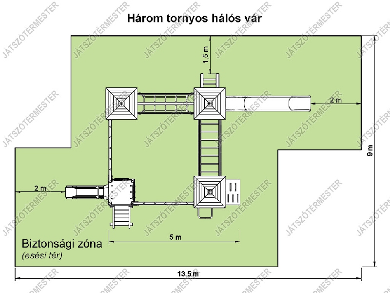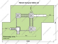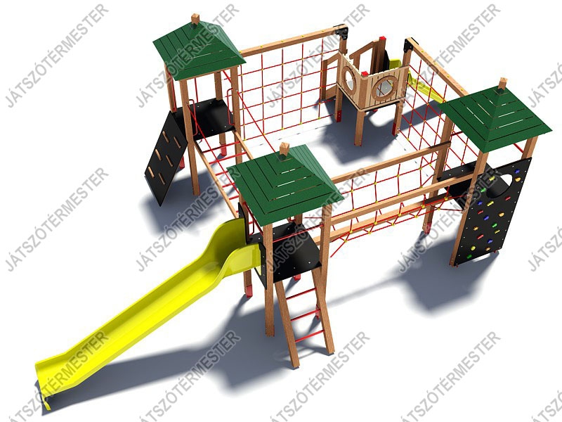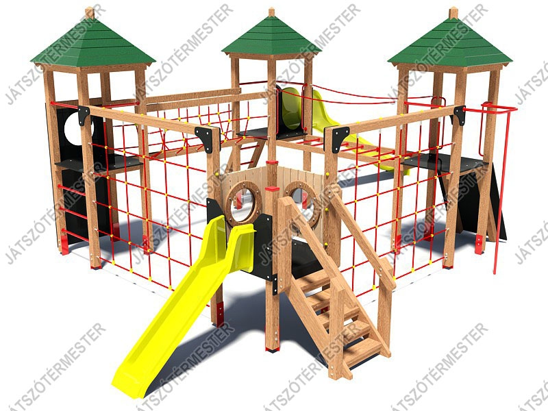 Az egyik legösszetettebb és legizgalmasabb a JÁTSZÓTÉRMESTER várak között. Három normál méretű toronyból és egy törpe bástyából áll, melyek a négyzet alakú vár sarokelemeit adják. A tornyok teteje deszkából készült sátortető, amely egyedi formát ad a játszóvárnak, a közterület, vagy az intézményi udvar egyik dizájn eleme is lehet.