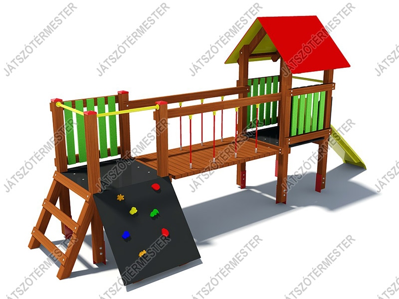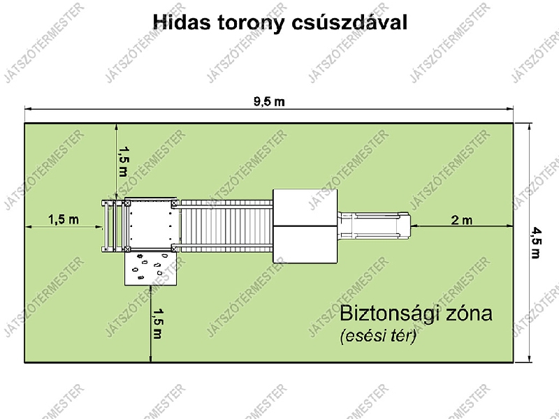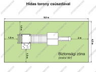 "Hidas torony csúszdával" játékunkat széles korosztálynak ajánljuk, bölcsődei-, óvodai udvarokra, iskolákba, de köztéri, önkormányzati játszóterekre egyaránt. Megrendelő kívánsága szerint több színben is kérhető. A játék platómagassága nem éri el az 1 m-t, ezért külön ütéscsillapító réteg kialakítása nem szükséges.